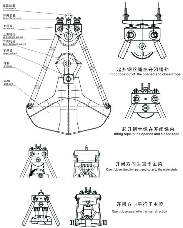 งานเริ่มขึ้นสนับสนุนเชือกลวดจะยกถังคว้าในสถานที่ที่ดีและจากนั้นปิดเชือกรองรับพึ่งพาน้ำหนักที่ตายแล้วของลำแสงลงบังคับให้ลำแสงขนาดใหญ่ลงเป็นศูนย์เปิดตัวคว้า เมื่อทั้งสองจานหูไม่ชนชิ้นส่วนฉีกส่วนที่คว้าเปิดสูงสุด เมื่อเปิดถังคว้านขึ้นรัศมีลำเลียงลำเลียงและคานขึ้นศูนย์กลางจะเพิ่มขึ้น จากนั้นก็ใส่เชือกรองลงมาการคว้าถังคว่ำลงบนวัสดุที่จับไว้ด้านบนและบรรจุรอบ ๆ เชือกที่เปิดและปิดลำเลียงลำแสงขึ้นและคานลำเลียงระยะทางย้อนกลับไปยังตำแหน่งดั้งเดิมซึ่งทำให้การจับภาพเสร็จสมบูรณ์ กระบวนการคว้าวัสดุ ในช่วงสุดท้ายยกเชือกเปิดและปิดและเชือกรองรับในเวลาเดียวกันถังควยทั้งหมดจะถูกยกขึ้นตามเครนให้ย้ายถังคว้าไปที่ลานจำหน่ายปลดปล่อยวัสดุ